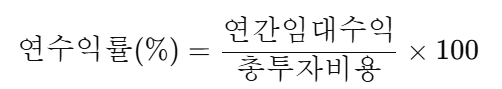 - 총 투자비용 = 매입가 + 취득세 + 법무사 비용 + 중개수수료 + 리모델링 비용 등 초기 비용 합계